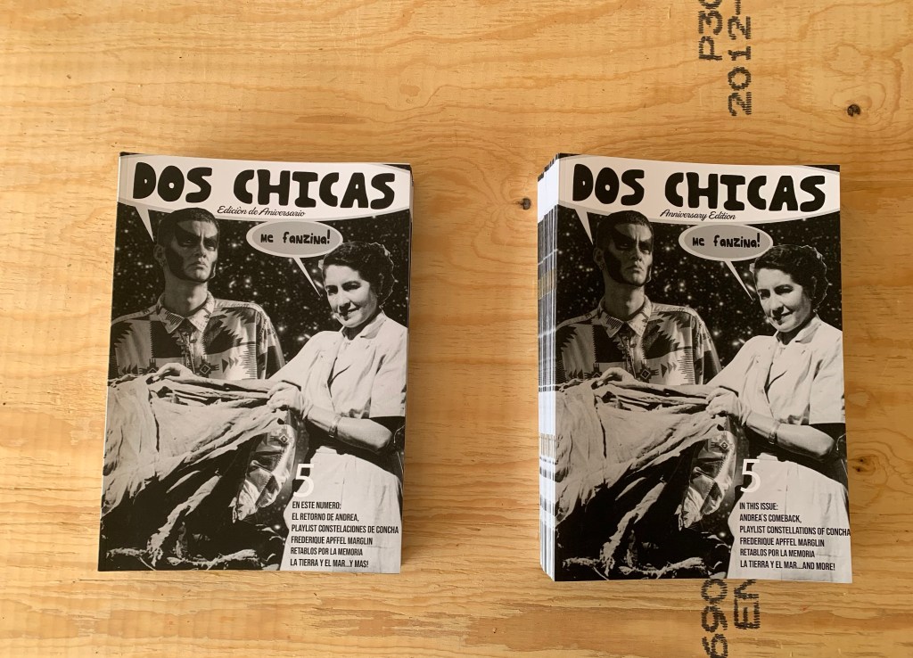 In the context of the exhibition The Land and the Sea, Fuxia 2 made possible the publication of issue 5 of the zine Dos Chicas, anniversary edition, with exclusive collaborations by Andrea Cánepa, Kristy Li Puma, Rita Ponce de León, a conversation with Carla, Gris and Jarí and an interview with Frederique Apffel Marglin.