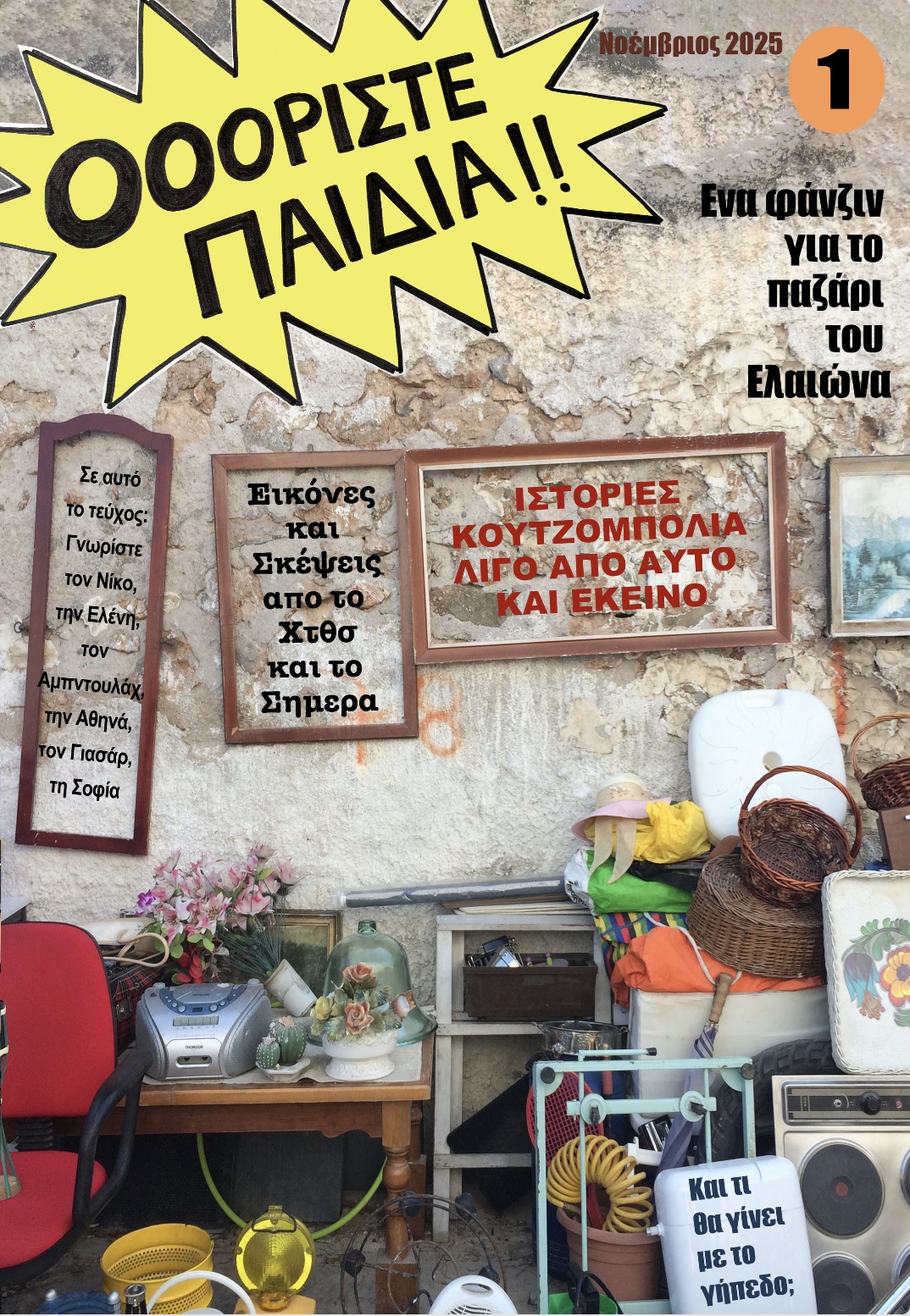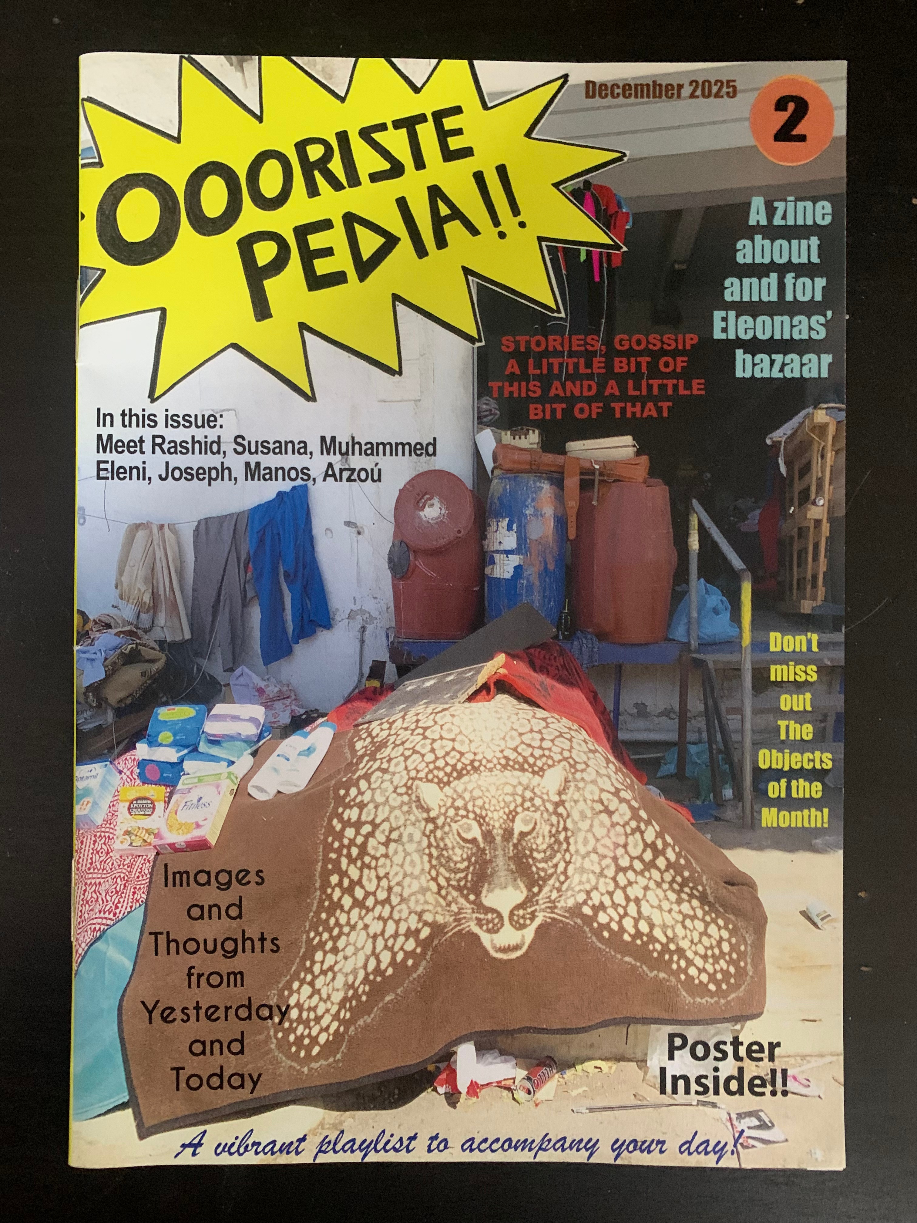 ¡Oooriste Pediá! es el nombre del fanzine que creé como parte de mi investigación «Trazando Rastros de Rastros», con el apoyo de Onassis AiR, de septiembre a diciembre de 2025. Es una publicación con fotografías y entrevistas realizadas a vendedores del mercadillo de Eleonas en Atenas. ¡Actualmente estoy creando Oooriste Pediá 3!