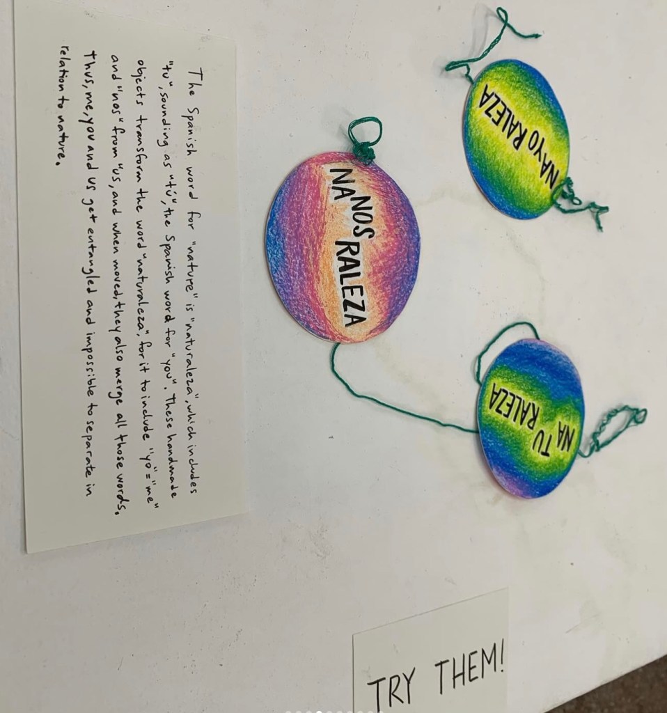Hice un video y unos taumatropos respondiendo a su invitación a reflexionar sobre lo que nos parece urgente hoy. La palabra en español para naturaleza es “naturaleza”, que incluye “tú”, que suena como “tú”. Estos objetos hechos a mano transforman la palabra “naturaleza” para que incluya “yo” = “me” y “nos” de “us”. Cuando juegas con ellos, fusionan todas estas palabras. Así, yo, tú y nosotros nos enredamos y es imposible separarlos en relación con la naturaleza.