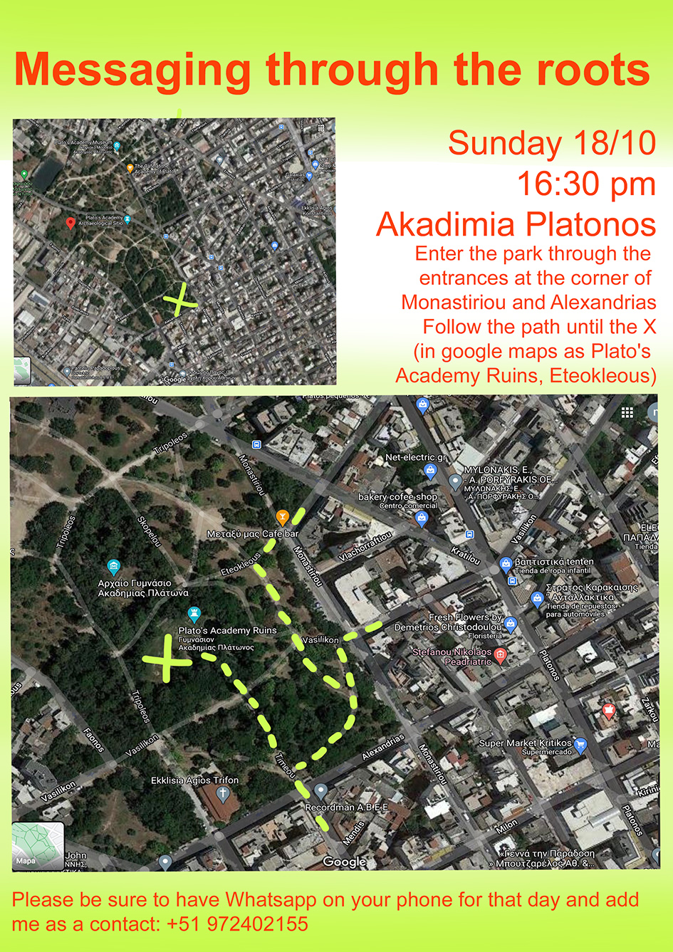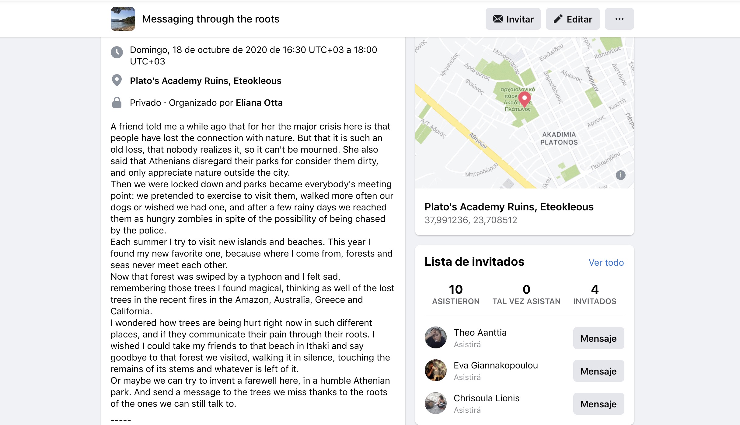 Un intercambio de mensajes entre seres humanos y árboles, lxs unxs haciendo de médiums para lxs otros, en su intento de despedirse de bosques perdidos en los últimos años. Hecho en el parque Academia Plátonos, Atenas, 2020.