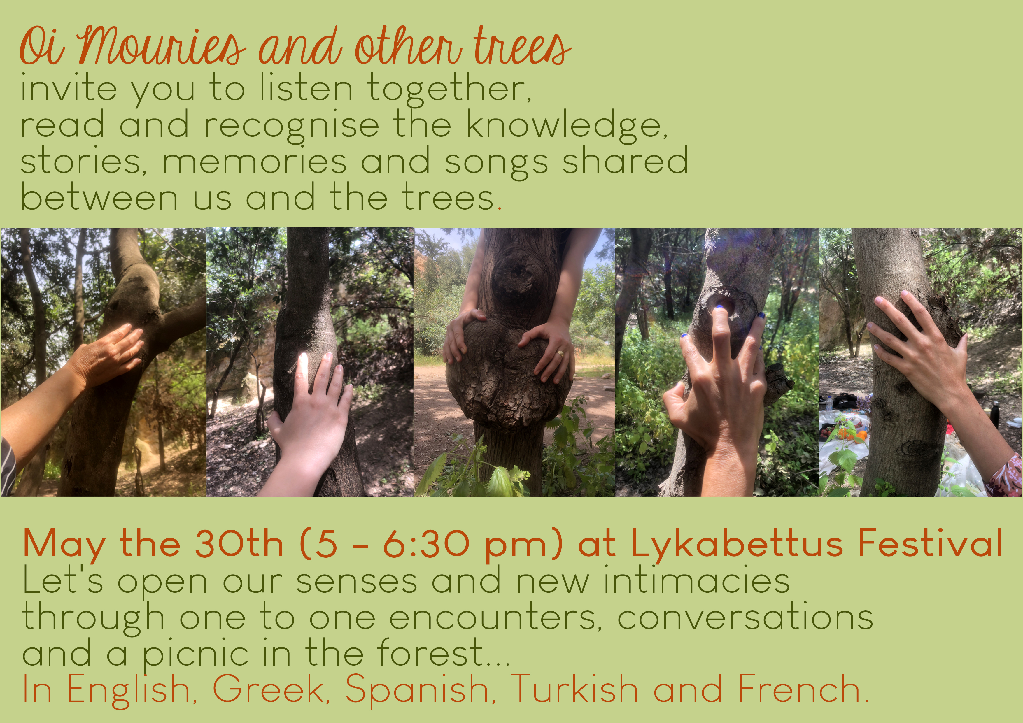 «The trees in Lykabettus hill, as well as the sky that hangs above it and the rock beneath those trees, may have a lot of knowledge that we as humans wandering on those hills, may not know. How can we learn from them? What do we want to learn from them? Are we ready to hear what they have to tell us? How do we relate to them, how do they relate to us? What is their experience of the city? How would we develop the means to hear their stories? We believe that by asking the right questions, one can begin to hear the stories of the trees. And as with any conversation, by listening to others we listen to ourselves. We aim to bring to light the stories, conscious and unconscious, that we relate to the hill, the trees, the parks, the public green spaces of our city.»