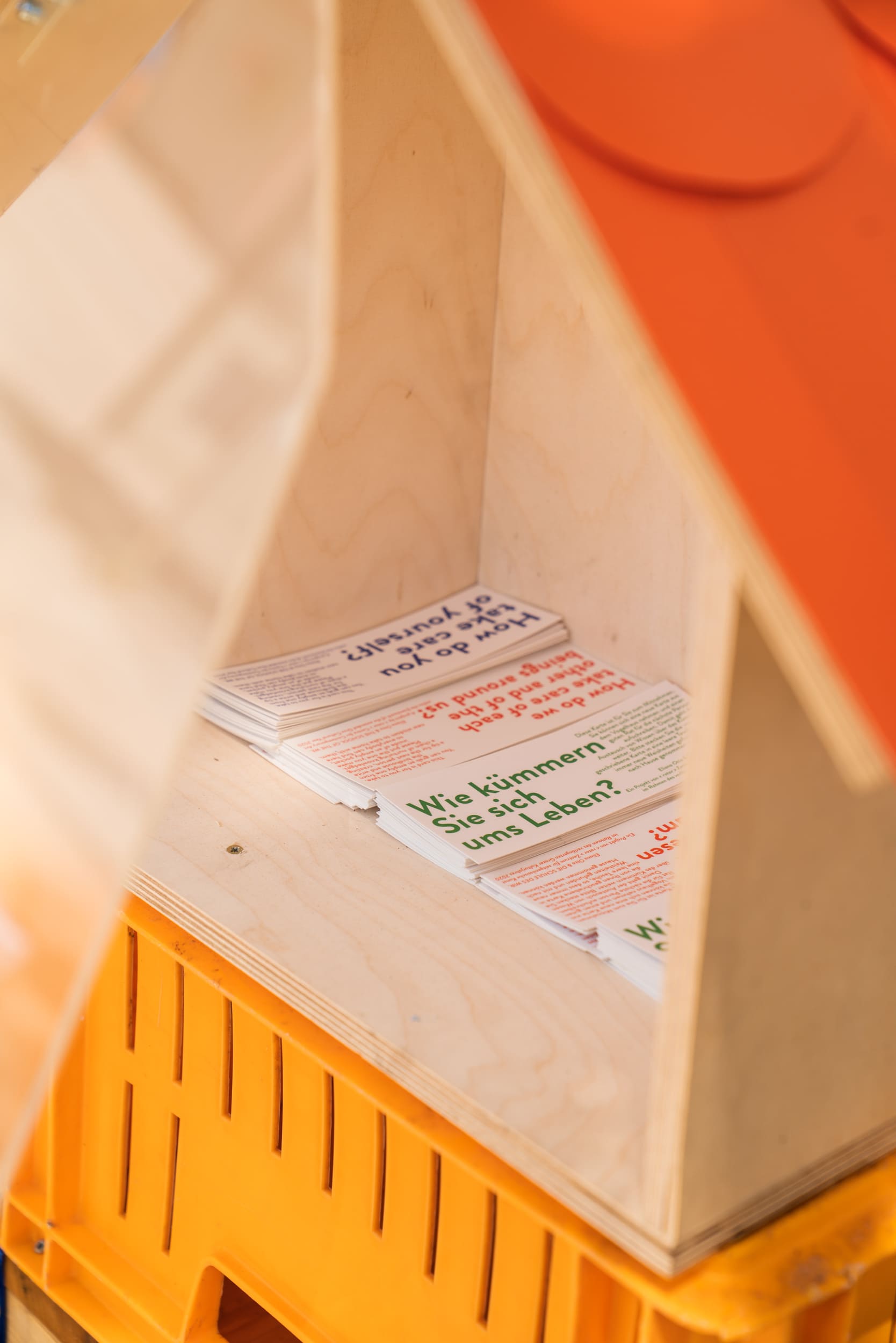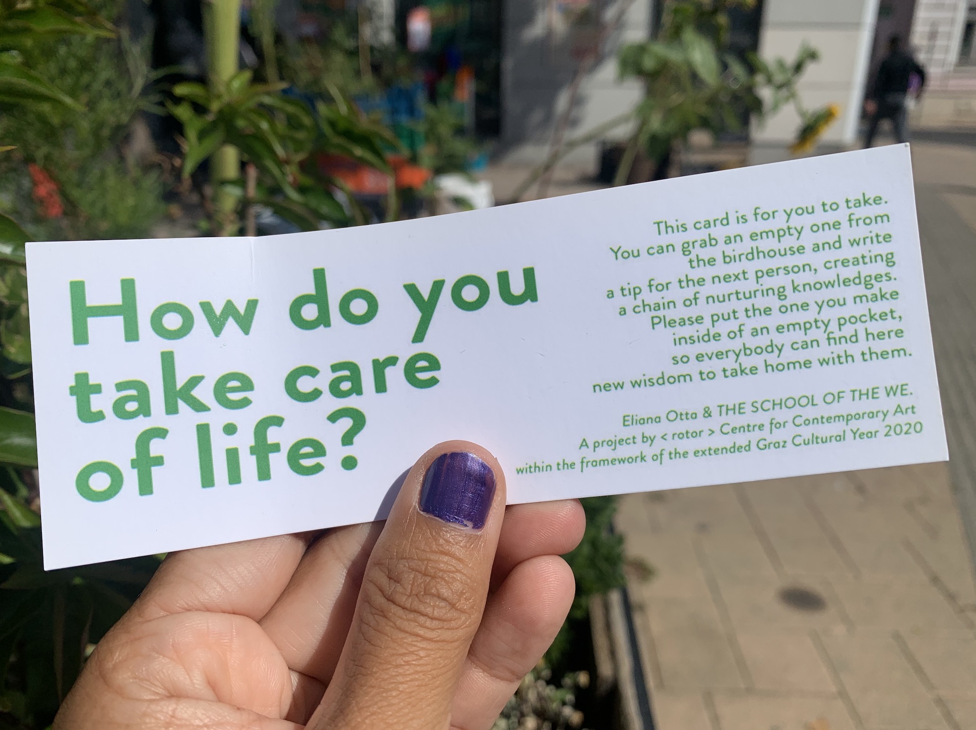 We were eating outside of Rotor after a very busy day, in which we realized it was too late to buy food when we finished working. We decided to buy food across the street, take chairs, plates and cutlery out, and eat under the lights of the beautiful sign of “The School of the We”. We were toasting and laughing, enjoying our relaxed meal at the open air, when an unknown girl approached us. She crossed the street and stood in front of our group. She said: “Can you invite me a beer? I’m heartbroken and to drink something would be helpful.” We all invited her to seat with us and handed her some wine. She said she was in her way to collect her things from her boyfriend’s house, because she just broke up with him. She told us a bit about her life and then asked about ours, a funny mix of people with different nationalities and languages. We explained our provenances and what united us there: participating in “The School of the We”. When it was my turn to speak, I explained that I was working on a collective garden where people could exchange ideas, intuitions and stories of care. The girl showed a very surprised expression and said that she had been there earlier, that she read the cards I left with questions, and that one question stroke her deeply. It was the one that said “How do you take care of yourself?”. She said that she found timely to reflect about that for a moment and that suddenly, the negative words that her now ex-boyfriend used to tell her came to her mind. And she decided it was enough of it.