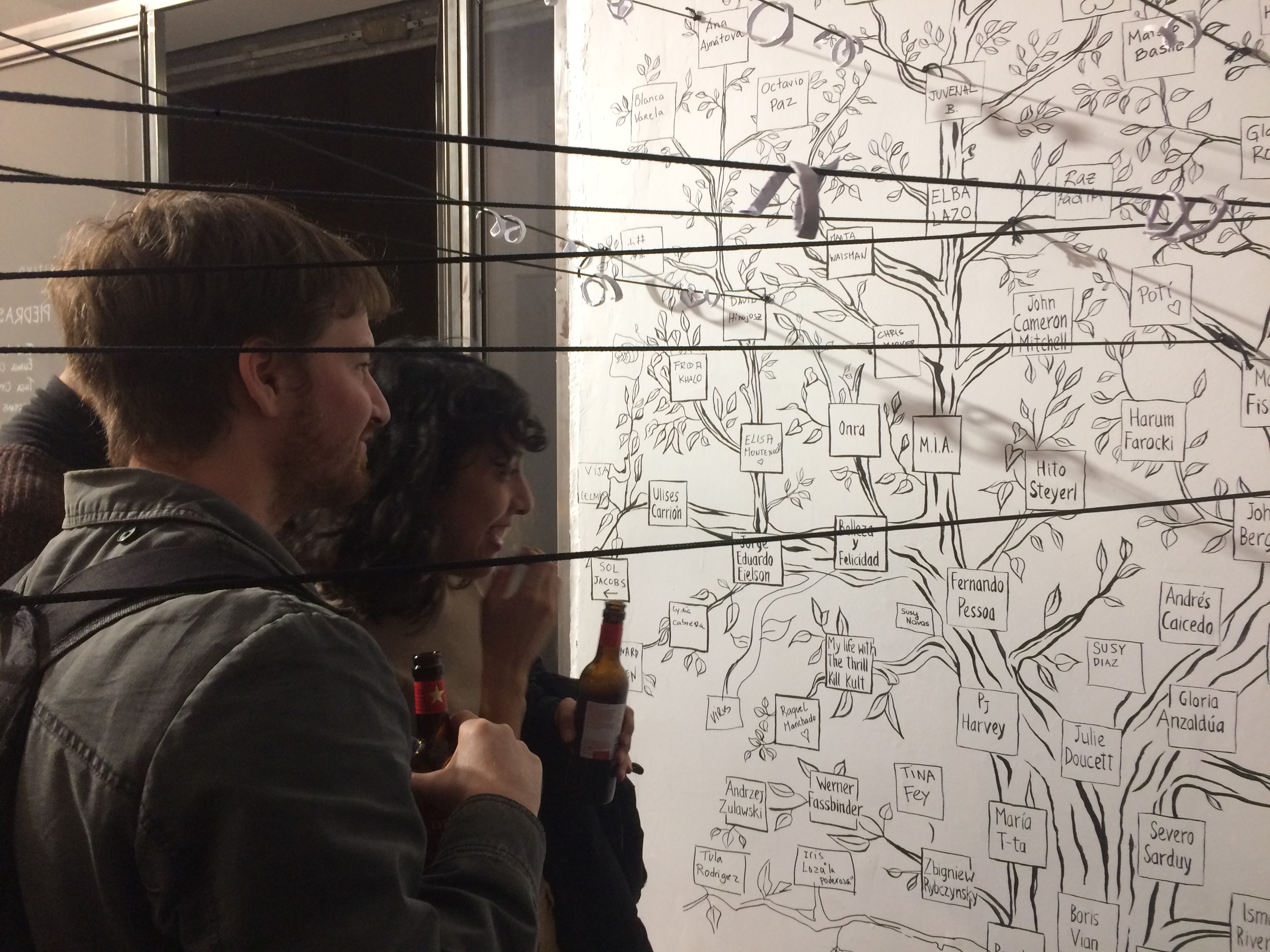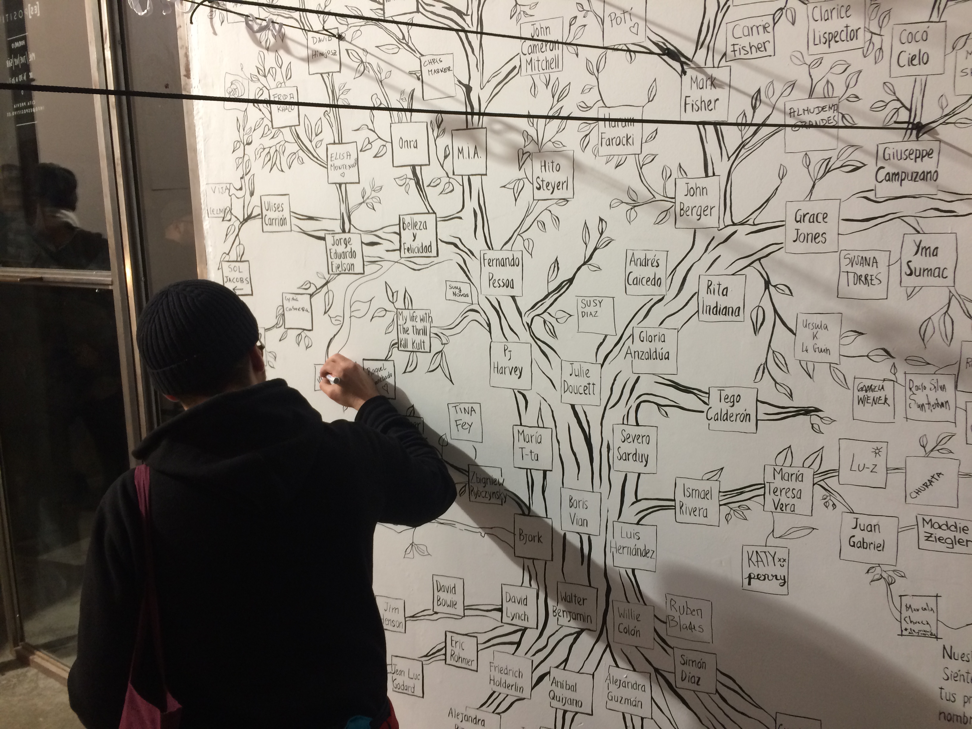 The yunza is a syncretic activity practiced in all Peru, during carnival. This celebration symbolizes abundance through a tree loaded with gifts, that, among dances and toasts, fall as an offering to the pachamama (mother earth). The Yunza Genealógica invited the assistants to share their most treasured references, merging them in the expanding branches. Thus, new “families” were created, giving shape to the genealogical garden of the participants. On the yunza day, we cut the “branches”, read and sang the texts, songs and images that they contained, receiving the gifts of a tree charged of knowledge.
