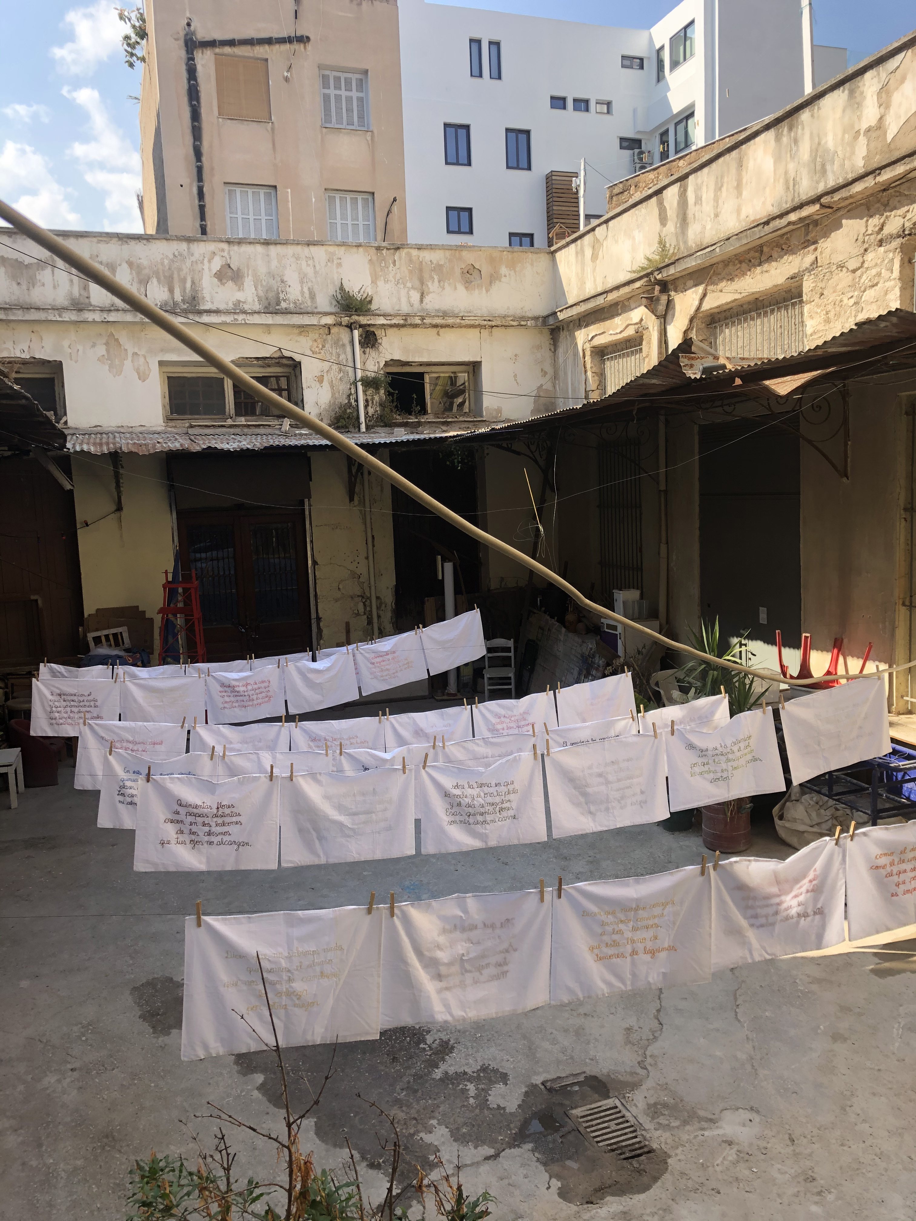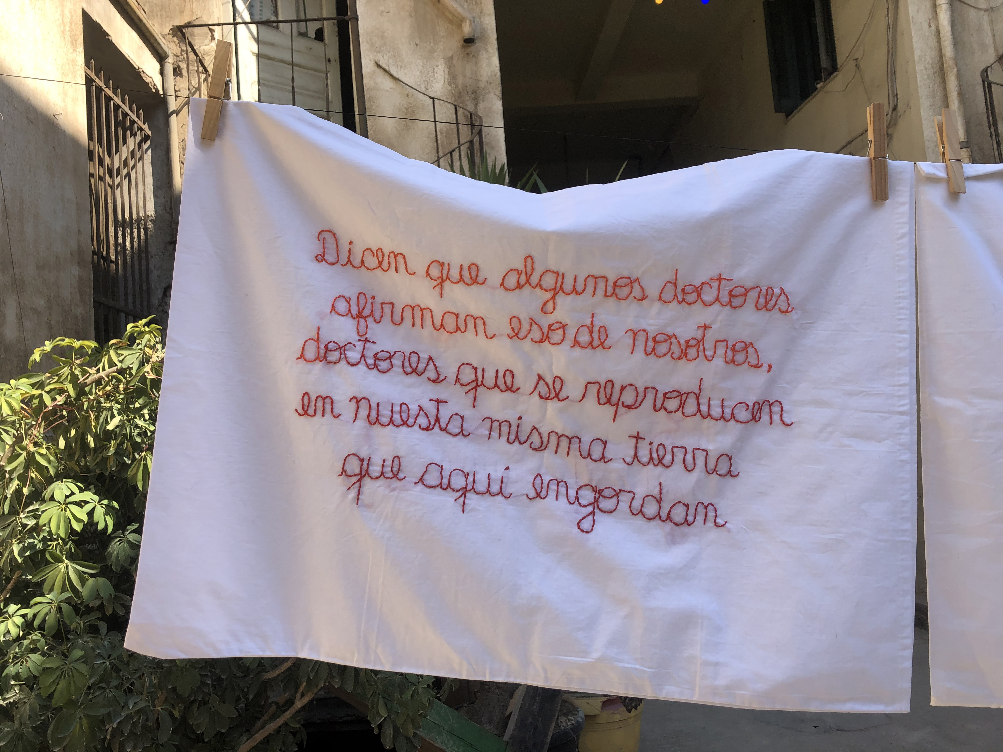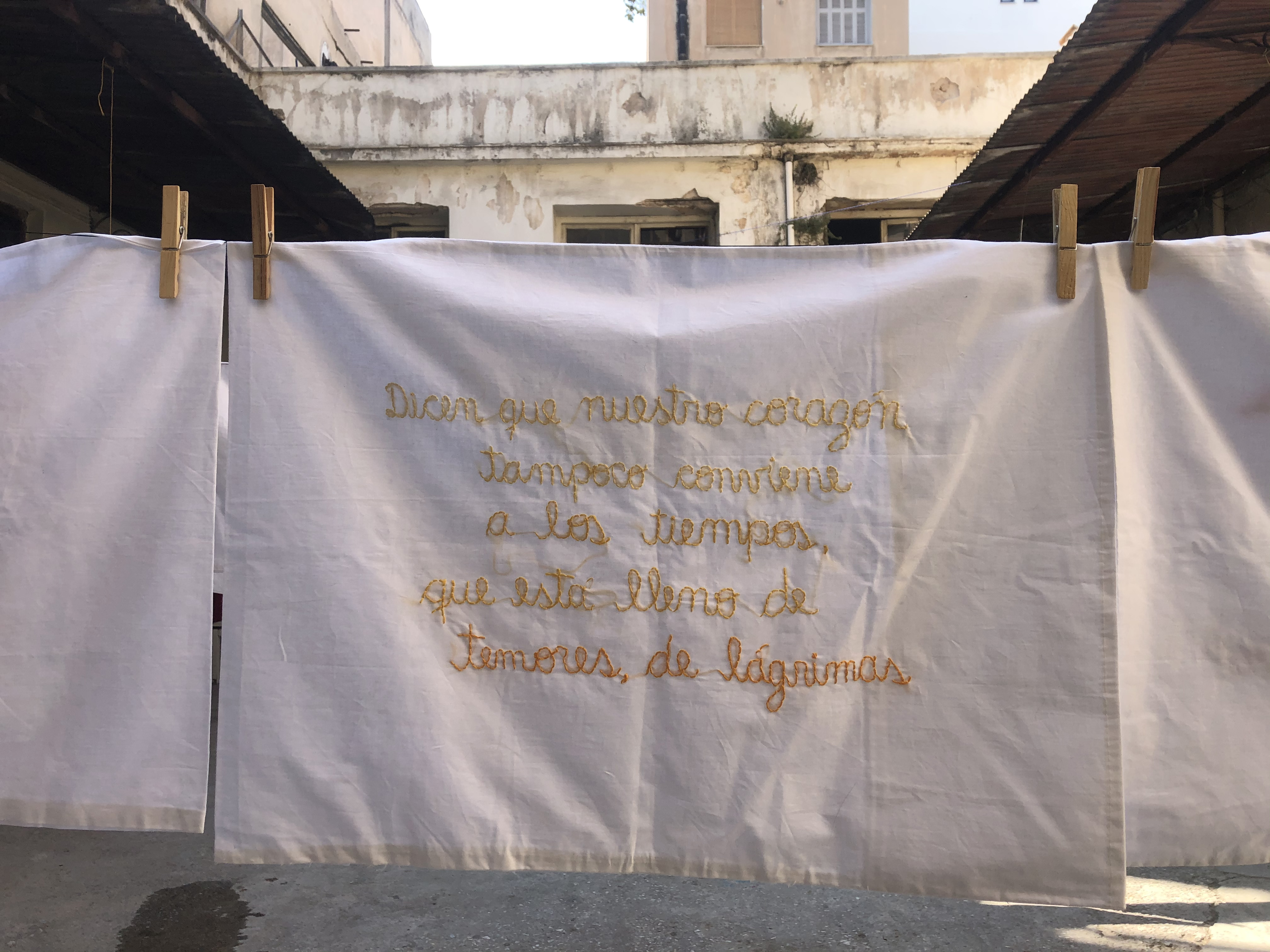 Mientras intentaba aprenderme el poema de memoria para la performance, decidí bordarlo en fundas de almohadas, pensando que el trabajo manual me ayudaría a hacerlo parte de mi más profundamente. La tarea, que resultó titánica, se volvió una de las actividades que sostuvieron mi solitaria cotidianidad durante el inicio de la pandemia del Covid-19. Al terminarla, instalé el conjunto en la exposición Manual Meditations, realizada en PS – Athens.