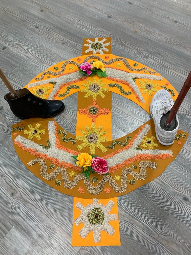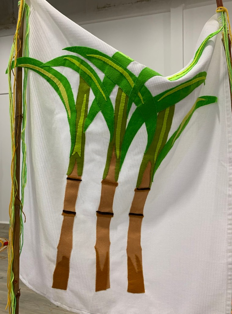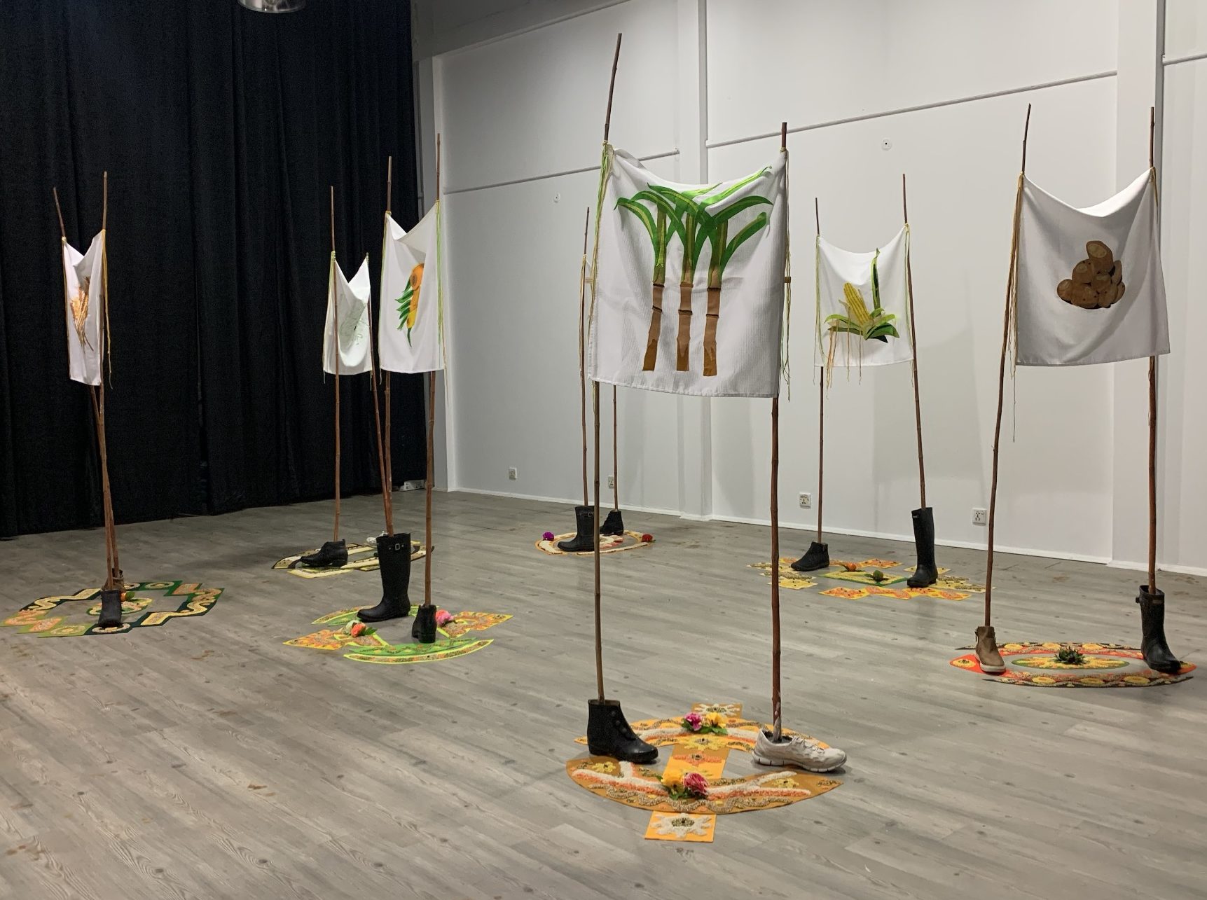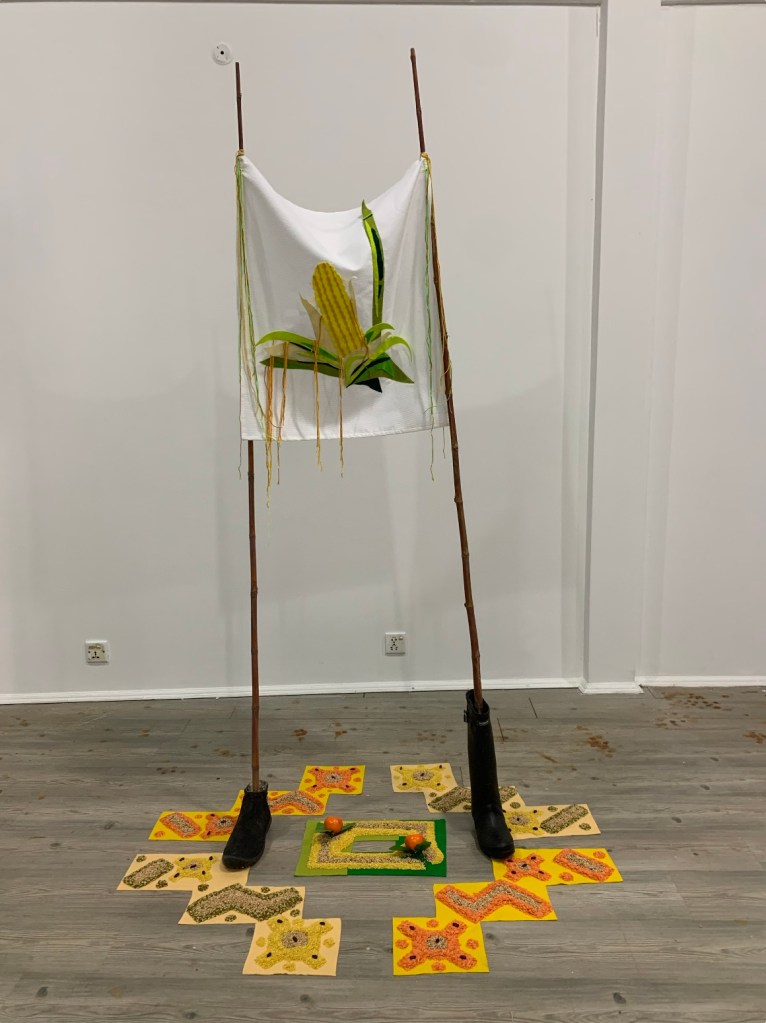 The work alludes to food crises brought on by capitalist dynamics, nature and workers’ exploitation, the alteration of environments for the sake of profit and climate change. The precarity of food production is shown through protest banners with images of agricultural produce common to Pakistan and Peru sewn into them, mounted in the shoes of workers. Grains and plants common to both countries are laid on the ground around the banners, in a reference to a traditional Peruvian practice of making offerings to the soil.