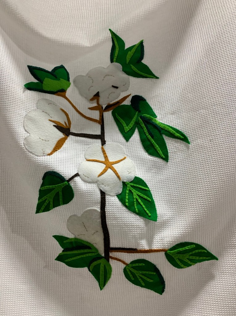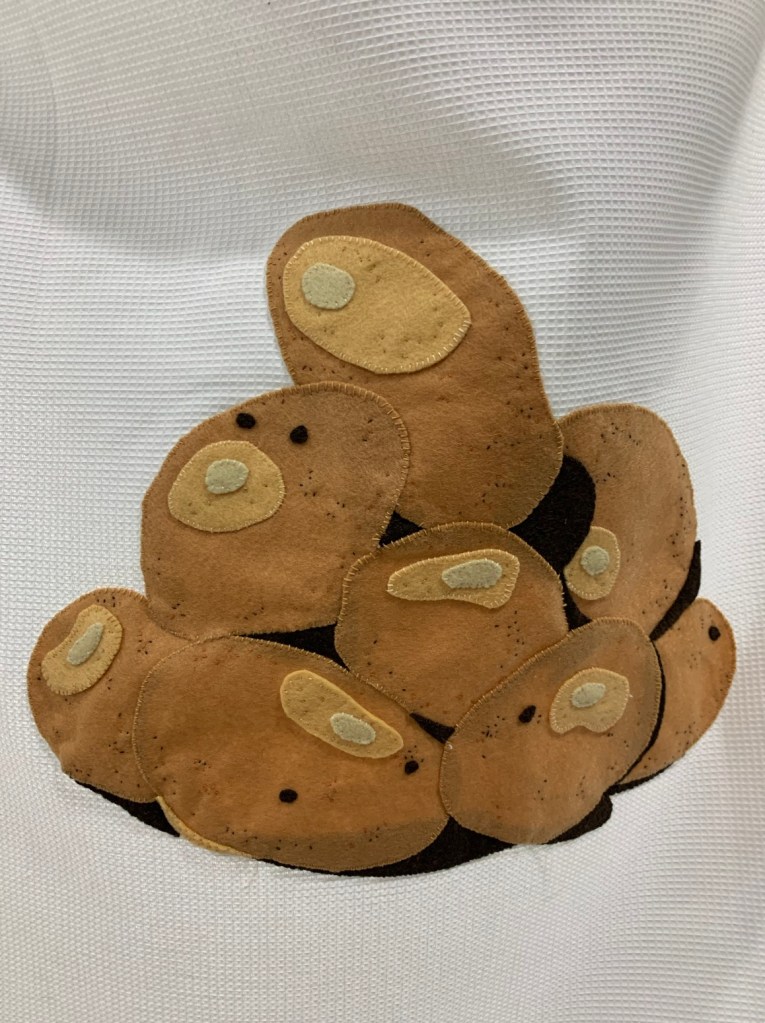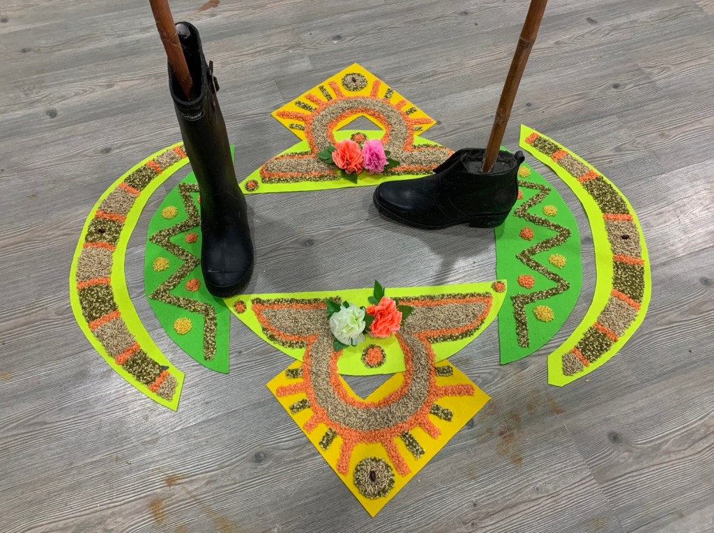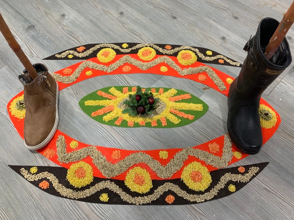 The work alludes to food crises brought on by capitalist dynamics, nature and workers’ exploitation, the alteration of environments for the sake of profit and climate change. The precarity of food production is shown through protest banners with images of agricultural produce common to Pakistan and Peru sewn into them, mounted in the shoes of workers. Grains and plants common to both countries are laid on the ground around the banners, in a reference to a traditional Peruvian practice of making offerings to the soil.