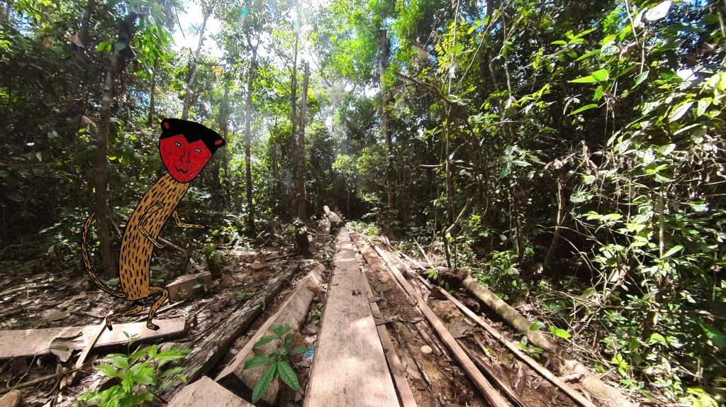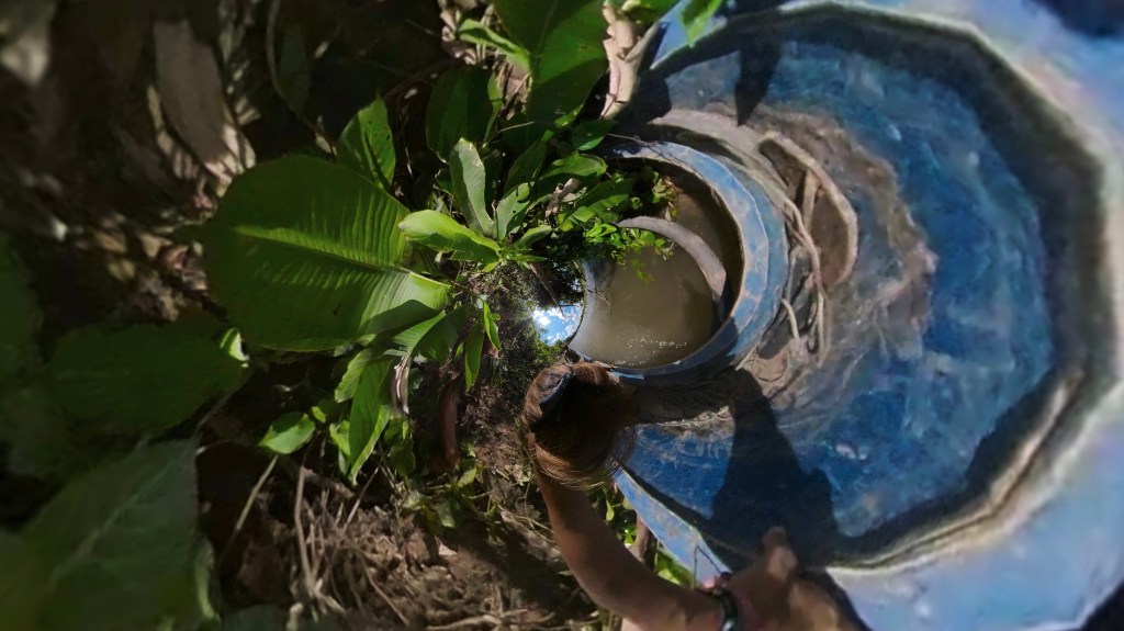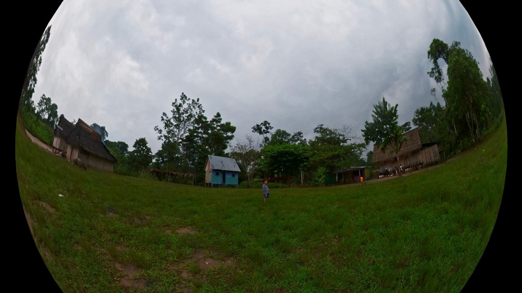Entre 2021 y 2023, trabajé en «Santuario Virtual para el Duelo Fertilizante», un proyecto artístico desarrollado a través de dibujos, audios, videos de 360 grados y una aplicación de realidad virtual (RV) alojada en un sitio web dedicado a líderes indígenas y activistas ambientales de la Amazonía peruana recientemente asesinados. El sitio web es http://www.lutoverde.com, y el proyecto fue posible gracias a la financiación de la iniciativa alemana «Impulsando lo Humano», tras ser seleccionado mediante una convocatoria abierta. Para este proyecto, viajé varias veces a cuatro comunidades indígenas que aceptaron compartir sus historias y mostrar sus territorios. Junto a ellas y un equipo, produjimos 35 cortometrajes a partir de incontables horas de material grabado con una cámara de 360 grados en la cabeza. De esta manera, los videos de 360 grados buscaban capturar la experiencia de mi cuerpo en esos espacios, mientras conocía comunidades amenazadas por la deforestación, el narcotráfico y el tráfico de tierras.