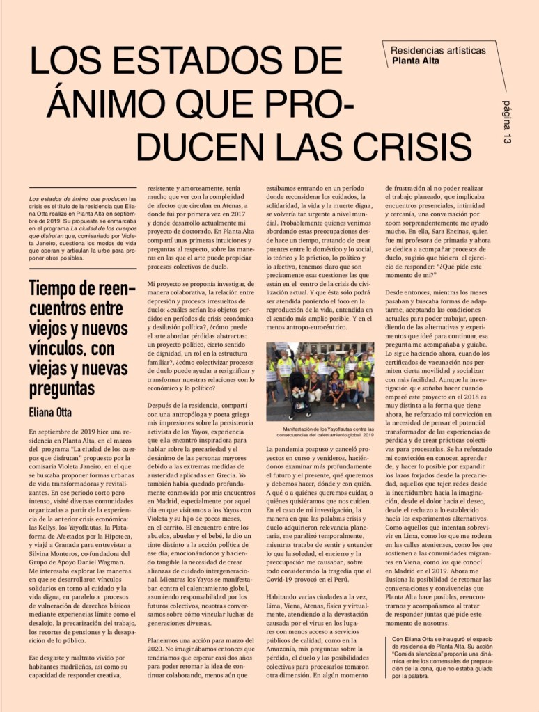 Con mucha alegría respondí a la invitación de Hablarenarte para colaborar en su periódico Caravana. En este caso, compartí algunas reflexiones en torno a mi experiencia como residente de su proyecto Planta Alta, a donde fui invitada por la curadora Violeta Janeiro. Las ideas que entonces surgieron quedaron truncadas por la pandemia y entonces… puedes leer el texto completo aquí.